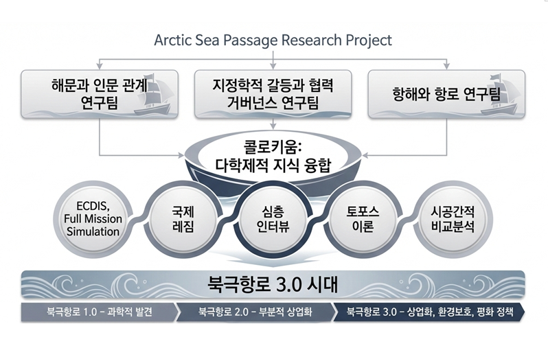 우리 연구소는 2020년부터 북극해 횡단항로 개척이 본격화될 것으로 예상되는 2050년까지를 ‘북극해 항로 3.0’ 시대로 명명하고, 이 거대한 전환기에 대응하기 위해 바다의 물리적 운동(海文)과 인간 활동(人文)의 상호작용을 탐구하는 학제적 토대 연구를 추진한다. 기존 연구가 주로 경제적 효율성이나 안보 논리에 집중해온 한계를 넘어, 본 프로젝트는 ‘바다인문학’의 관점에서 북극해 항로의 지속 가능한 미래를 위한 학술적·실천적 해법을 제시하고자 한다.