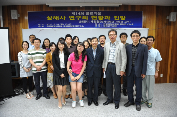 | 내용 | 한국해양대학교 부설 국제해양문제연구소가 주최하며, HK 해항도시의 문화교섭학 연구단이 기획하는 제 14회 콜로키움이 2010년 6월 18일(금요일) 3시 한국해양대학교 종합관 세미나실(214호)에서 개최되었다. “해항도시 네트워크와 문화교섭”이라는 주제로 기획된 본 콜로키움은 중국 근현대사 연구가로 알려진 신라대학교 사학과 배경한 교수를 발표자로 모시고 진행되었다. 배경한 교수는 “상해사연구의 현황과 전망”라는 주제로 진행된 발표에서, 중국 근현대사에서 상해사가 차지하는 비중과 함께 중국 최초의 도시사로 연구되었던 상해사가 가지는 중요성을 설명하였다. 그는 “근대”와 “근대성”의 현장이자, “동서문화 융합의 실험실”이었던 상해에 대한 관심이, 국내, 중국, 일본과 구미에서 현재까지 지속되고 있음을 강조하였다. 배경한 교수는 국내를 포함한 전 세계의 주요한 상해사 연구 경향과 학자들을 더불어 소개하고, 이러한 관점을 더욱 확대한 다양하며 심도 있는 부산-상해 교류사 연구가 활성화되기를 희망하였다. 제 14회 콜로키움은 현재 중국의 역동성과 변화를 그대로 반영하고 있는 상해에 대한 연구라는 점에서 더욱 많은 관심이 집중되는 시간이 되었다. 14회 콜로키움은 상해 연구에 대한 방법론에 대한 전문적인 질문과 현 상해의 모습이 보여주는 가능성과 문제점에 대한 시사적 질문이 함께하는 의미 있는 토론을 끝으로 막을 내렸다.